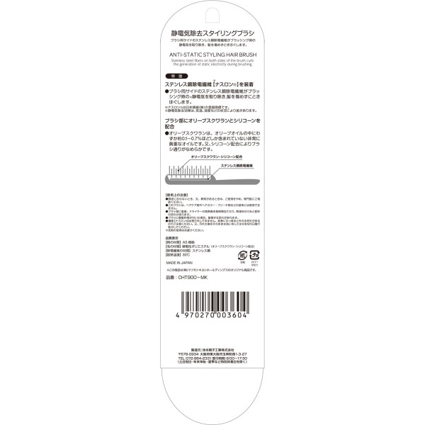 ブラシ部両サイドのステンレス鋼除電繊維がブラッシング時の静電気を除去します。