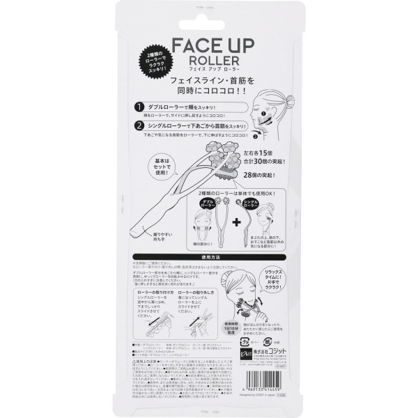 頬をダブルローラーでサイドに押し戻すようにコロコロ、シングルローラーで下あごから首筋をコロコロ、シングルローラーには28個の突起、ダブルローラーには左右各15個の突起がありシングルローラーは取り外すことも出来ます。