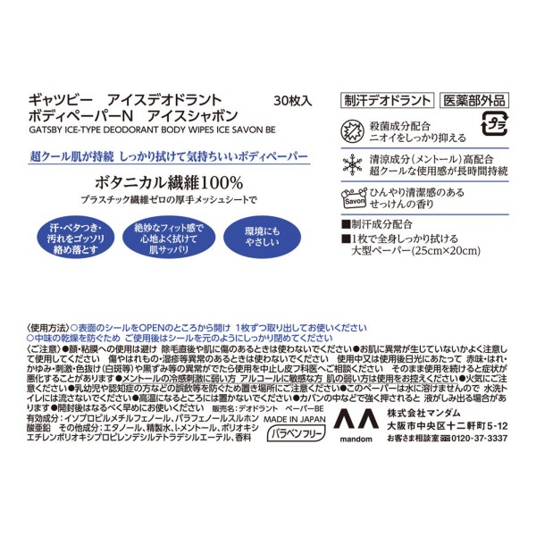 개츠비 아이스 데오도란트 바디페이퍼 아이스 사봉 30매 만담 > 보디 페이퍼