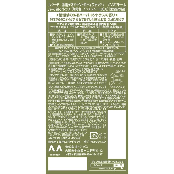 루시도 약용 데오도란트 바디워시 논 멘톨 허브 시트러스 450ml 만담 > 전신 세정료