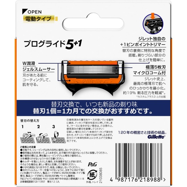 ジレットプログライド 5+1 電動タイプ 替刃大容量パック12コ入 すべてのプログライド、フュージョン、スキンガードのホルダーで使用できます。