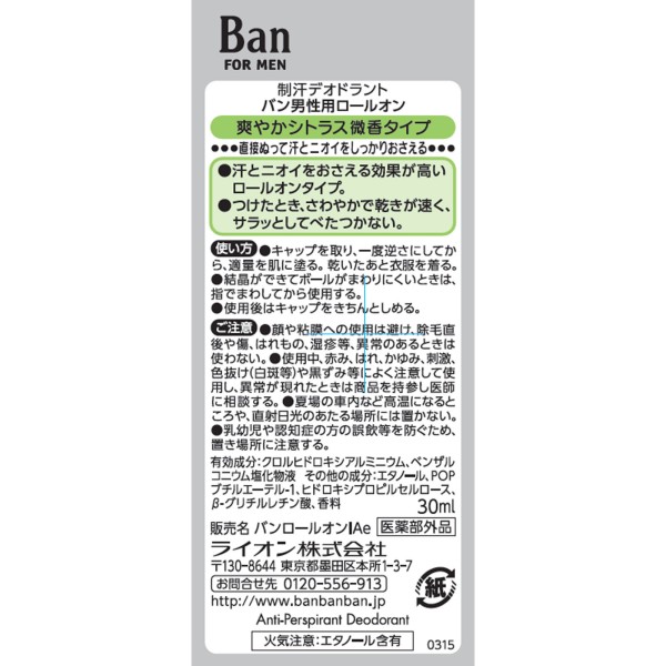 반 남성용 롤온 30ml 라이온 > 발한 억제제