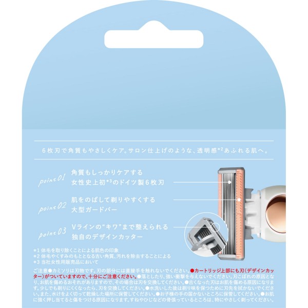6枚刃で角質もやさしくケア。透明感あふれる素肌へ。※透明感:体毛やくすみのもととなる古い角質、汚れを除去することによる女性史上初のドイツ製6枚刃で角質もやさしくケア。大型ガードバーやデザインカッターなど独自のカートリッジ構造でサロン仕上げのような、透明感*あふれる素肌へ。