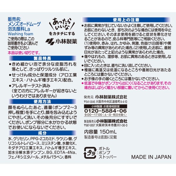 맨즈 오드뮤게 거품 세안료 산뜻 타입 150ml 고바야시제약
