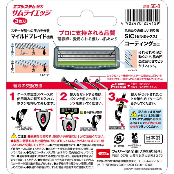 ・それぞれの刃が独立して動くから、肌のわずかな高低差になじみ、ヒゲのみをキャッチ。・さらに、刃先にかかる圧力を分散させ、肌への負担を軽減させる「マイルドブレイド機構」を採用。・刃には、なめらかで耐久性に優れたSiCセラミックスコーティングを新採用。・サムライエッジホルダーでご使用になると、新機構サスペンション付きヘッドが肌への密着効果をさらに高めます。・シェービングに求められる品質と価格を訴求します。・現在市販されているフェザーのカートリッジ替刃式ホルダーなら、全て装着可能なエフシステムを採用しています。(F2、MR3ネオ、サムライエッジ)