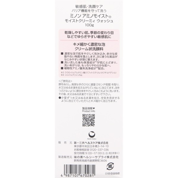 미노온 아미노 모이스트 크리미 워시 100g 다이이치산쿄 헬스케어 > 페이스 케어