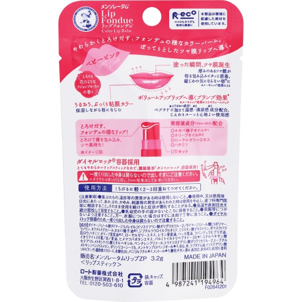 「メンソレータムリップフォンデュ(ベビーピンク)」はやわらかくとろけだす、フォンデュのようなボリュームUPプランパー※1です。厚みのあるツヤ膜が唇を包み込みピタっと密着、縦じわの気にならないぽってりとしたリップへ導いてくれます。ダイヤルロック容器を採用しており、フジョンフローラルの香りでじんわりスーッと心地よい使用感をお楽しみいただけます。 ※1メーキャップ効果によりボリュームアップするリップ