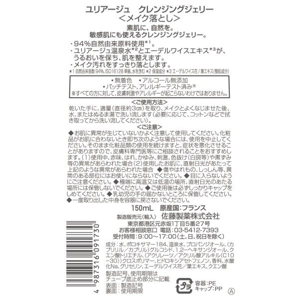 유리아쥬 클렌징젤리 150ml 사토제약 > 페이스 케어