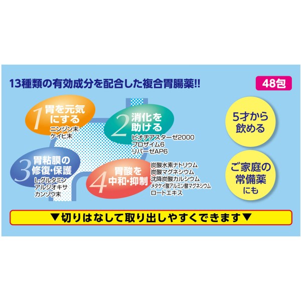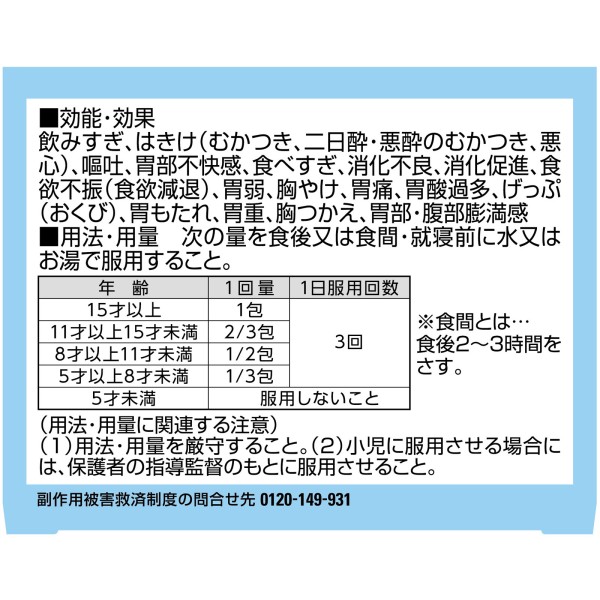食べすぎ・飲みすぎ・胸やけや、夜遅い食事で胃がもたれるなどの不快な症状に効く胃腸薬です。