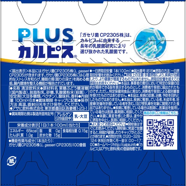 カルピス(R)に由来する長年の乳酸菌研究により選び抜かれたガセリ菌CP2305株を配合した小さなカルピス(R)です。