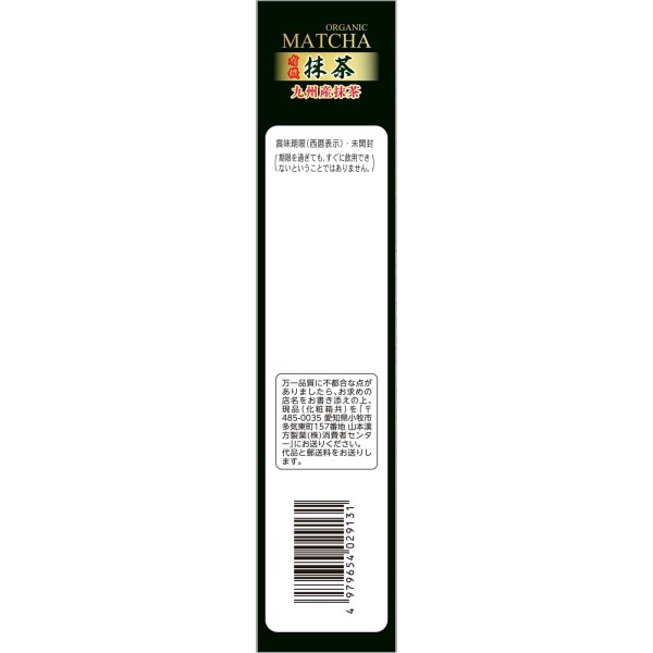 有機JASの認定を受けたオーガニック抹茶100%。九州産の「有機碾茶」を使用し、自社工場にて製粉しております