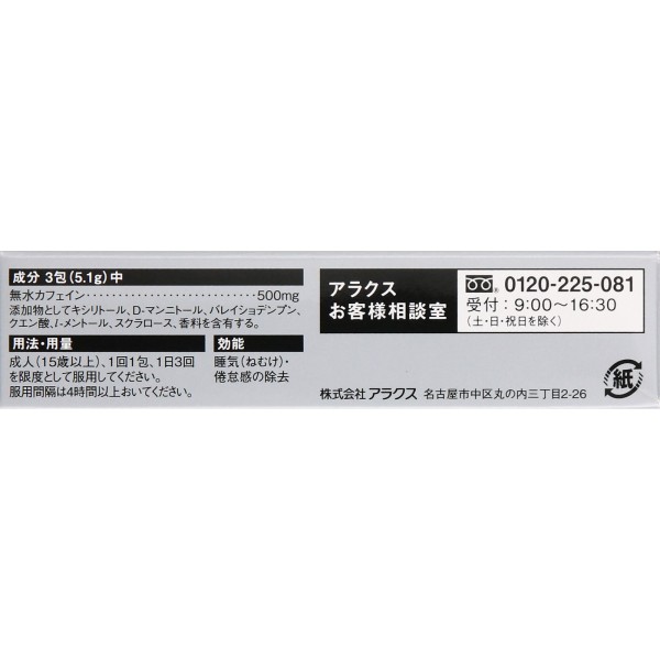 シャキーン!!としたCoolな刺激がうれしい、ほろ苦酸っぱいグレープフルーツ味の眠気防止薬です。3包中に無水カフェイン500mgを配合したうえ、口溶けのよい白色の顆粒剤なので、眠ってはいけないときにねむけを感じたら、1日3回、どこでも水なしでも服用できます。