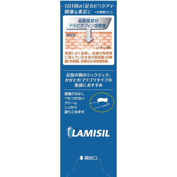 ●有効成分「テルビナフィン塩酸塩」の優れた殺真菌作用と角質層への浸透力は、1日1回の塗布で薬剤が患部に留まり、かゆみや痛みなどを引き起こす水虫・たむしに持続的に効果を発揮し、症状を治していきます。
