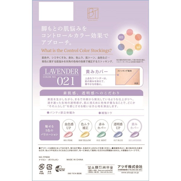 脚もとの肌悩みをコントロールカラー効果でアプローチ。肌色や、シミやくすみ、赤み、色ムラ、肌トーン、血色など、発色に関する肌悩みを対角の色味の効果で補正するストッキング。素肌を生かしながら、まるで内側から発光しているような仕上がりへ。透き通った生地の透明感が、肌に控えめに色味が重なることで、どこか”その人らしさ”を感じさせる軽いはき心地を演出します。上品なラベンダーは、肌の黄みを抑えて、華やかな印象に。