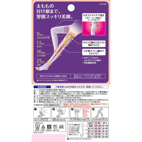 ●4段階圧力設計で太ももの付け根まで翌朝スッキリ美脚(足首21hPa、ふくらはぎ16hPa、太もも11hPa、太ももの付け根9hPa)。