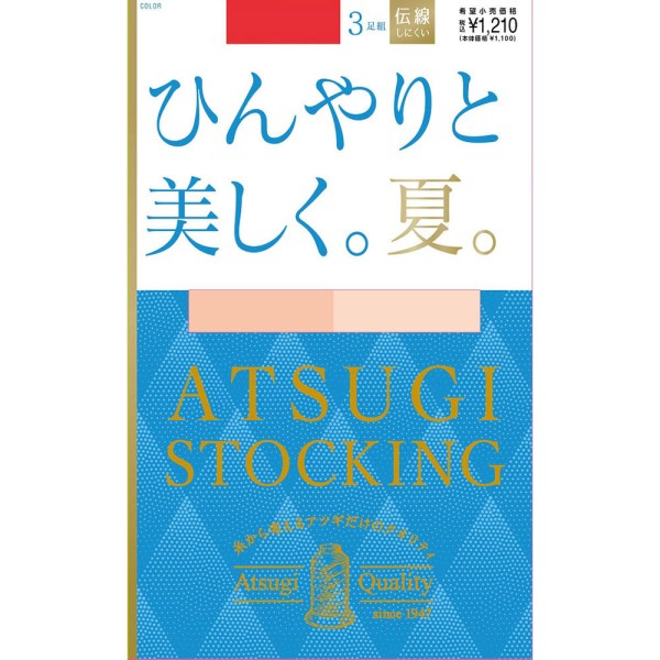 糸から考えるアツギだけのクオリティ。特殊な編設計で、放熱を促す。クールエナジー技術を採用。なめらかな肌触りのゾッキ編みタイプ。伝線しにくい。デオドラント消臭。ウエストゴムが伸びやすく、幅の広いテープでくい込みにくい快適ウエストテープ。ムレにくく快適なパンティ部メッシュ編み。つま先補強で安心。衣類がまとわりつきにくい静電気防止加工。肌に届く紫外線を減らすUV対策加工。サラッとしてムレにくい吸汗加工。前後がわかるバックマーク付。