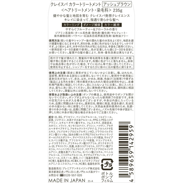 클레이엔스 클레이 스파 컬러 트리트먼트 애시 브라운 235g > 백발용 컬러 트리트먼트