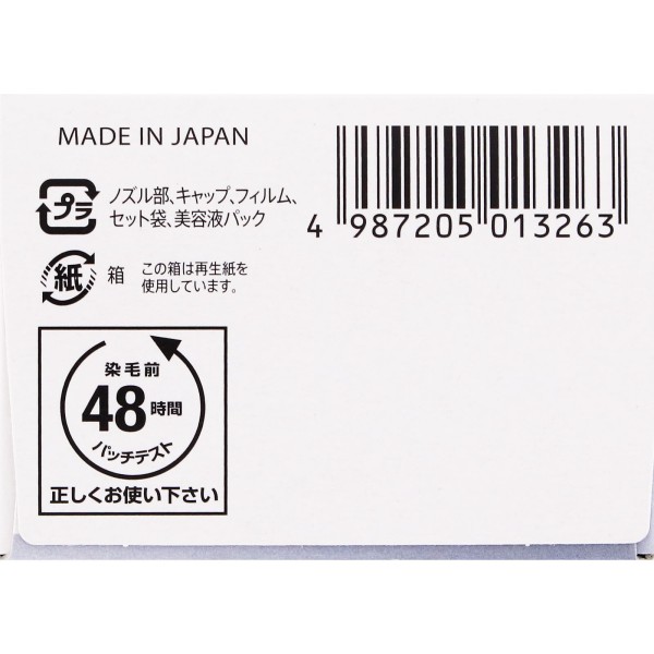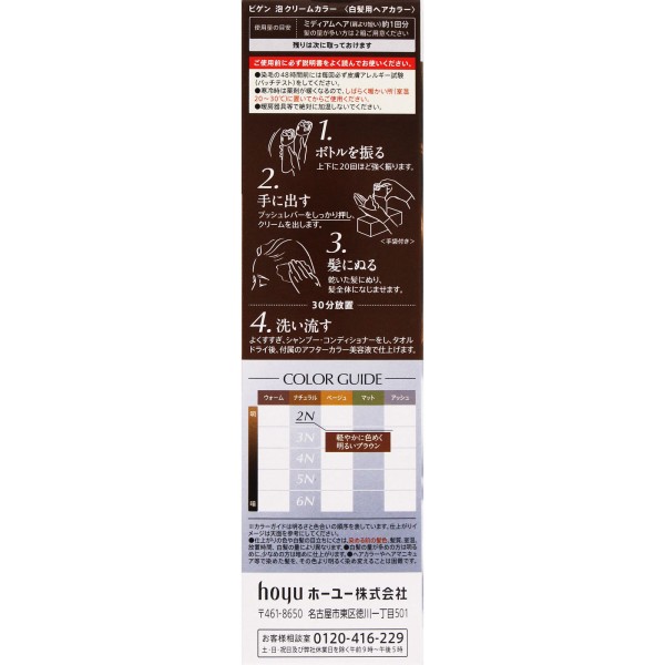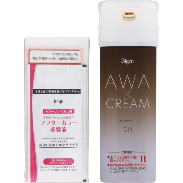 クリームの「染毛力」と泡の「使いやすさ」を兼ね備えたハイブリッド剤。するりと伸びてしっかり密着。新感触のもち泡クリーム。手塗りで簡単。生え際から広範囲までムラなくキレイ。赤みを抑えた色作りで柔らかな髪色に。美しい髪色のために6種のこだわり成分配合・色持ち成分 (タウリン・テアニン)・ツヤ成分※1 (ツバキ油・ヒマワリ油) ※1 毛髪保護成分 ・うるおい成分 (海藻エキス・海洋コラーゲン※2) ※2 水溶性コラーゲン液-3。カラー後の髪をケアするアフターカラー美容液付き