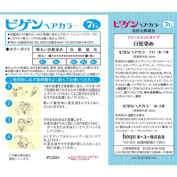 비겐 헤어 컬러 7G 자연스러운 흑갈색 1제 40ml와 2제 40ml 40ml×2 호유 > 백발용 액상