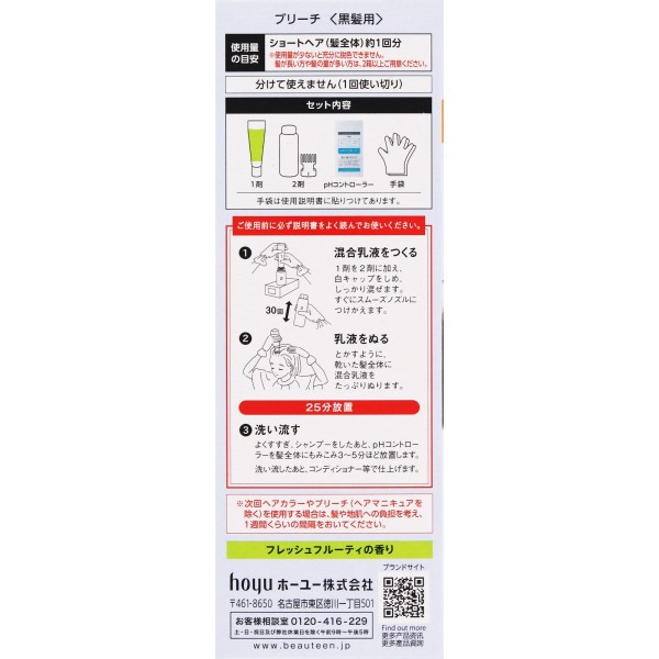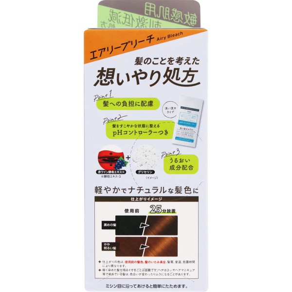 ・敏感肌用、刺激低減処方※ 。髪のことを考えた想いやり処方(※当社ブリーチ商品と比べて) ・ナチュラル脱色。軽やかでナチュラルな髪色に ・洗い流すタイプの「pHコントローラー」付き。髪をすこやかな状態に整える ・うるおい成分※配合。(※赤ワイン酵母エキス(酵母エキス-3)、グリセリン) ・フレッシュフルーティの香り