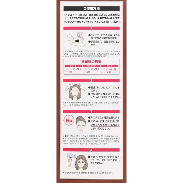 「プレミアムカラートリートメント」は、自宅で簡単・手軽に、白髪をしっかり色濃く、理想の髪色に染めることができるカラートリートメントです。放置時間は1回5分。髪になじむ色設計で、使うたび白髪が深く色づき、美しく自然な思い通りの髪色へ。さらに、キューティクルまでケアする[カラーフィックス・キューティクルコート]が、色落ちを防ぎ、染めたての色つやを持続させるとともに、うねりをケアする機能により、白髪の目立たない、若々しく美しい髪へと導きます。髪と地肌にやさしく、刺激臭のない処方のため、トリートメントとして毎日お使いいただけます。