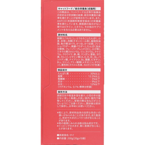 真鯛風味のかつお節チップ、そしてカリッとした食感がネコちゃんの食欲をそそる総合栄養食。合成着色料無添加。