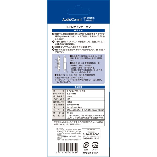 OHM 컨트롤러 포함 스마트폰 이어폰 HP-B172N-K 옴전기 > 오디오 액세서리