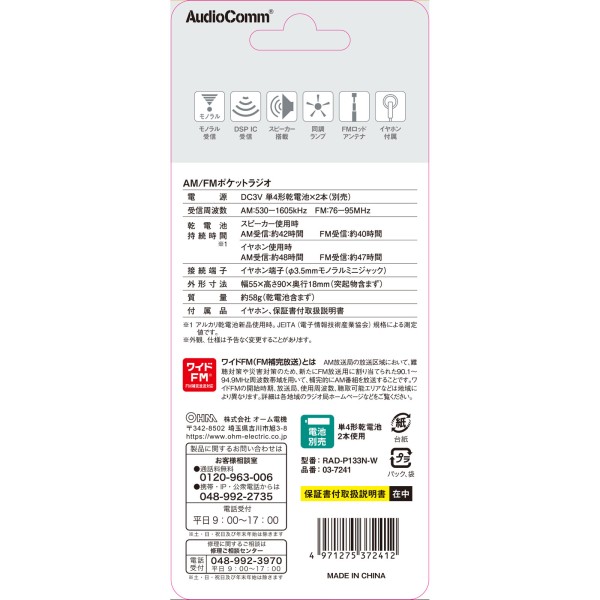 OHM 포켓 라디오 화이트 RAD-P133-W 옴전기 > 라디오