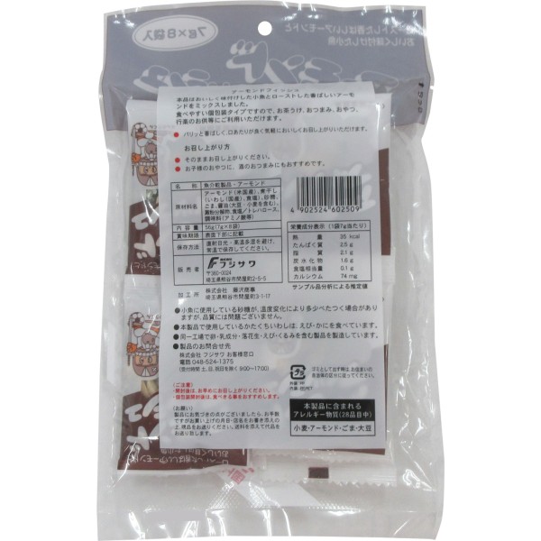 おいしく味付けした小魚とローストした香ばしいアーモンドをミックスしました。食べやすい個包装タイプなので、お茶菓子、おつまみ、おやつ、行楽のお供にご利用頂けます。パリッと香ばしく、口あたりが良く気軽においしくお召し上がり頂けます。学校給食採用商品なので、幅広い層に認知して頂けている商品です。