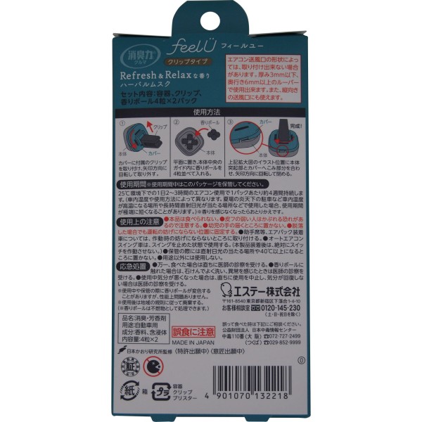 탈취력 차량용 feelU 본체 허벌 머스크 클립타입 2회분 > 차내 방향제·탈취제 놓는형(액체·젤·고형)