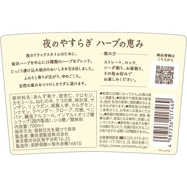 夜のリラックスタイムのために、東洋ハーブを中心に15種類のハーブをブレンドした、香りに癒されるやさしいお酒。