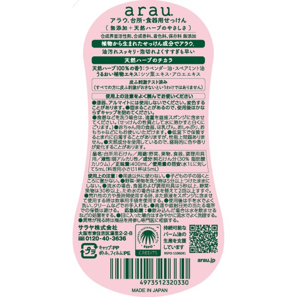 arau.(아라우) 주방용 비누 본체 400ml > 액체 세제