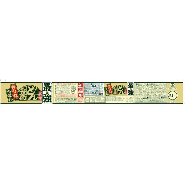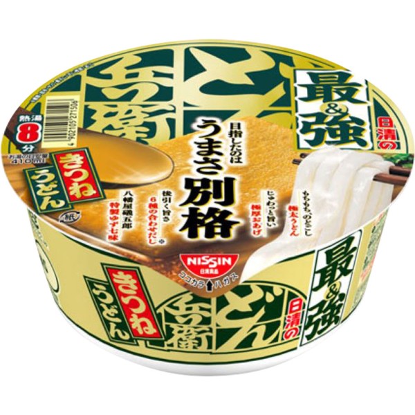 麺はどん兵衛きつねうどんよりさらに太くもちもちした麺、だしは昆布の後引きが特長の6種の合わせだし、きつねうどんよりさらにぶ厚いお揚げ、長野の八幡屋磯五郎のゆず七味が入った、うまさ別格の最強どん兵衛。