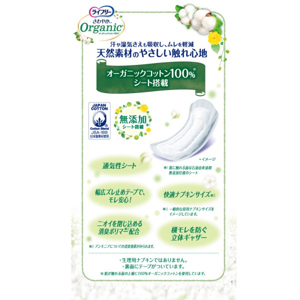 オーガニックコットン100%※1シート搭載。~天然素材の触れ心地~汗や湿気さえも吸収し、ムレを軽減!ニオイを閉じ込める消臭ポリマー※2配合。※1肌が触れる面の上層に100%オーガニックコットンを使用しています。※2アンモニアについての消臭効果が見られます。