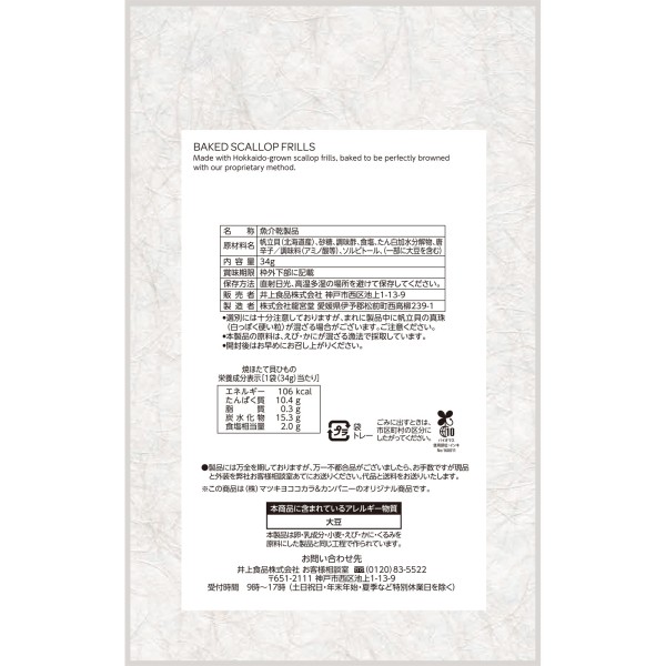 北海道産のほたて貝の貝ひもを使用し、噛めば噛むほどに、甘辛い味わいと磯の風味が口の中にひろがります。