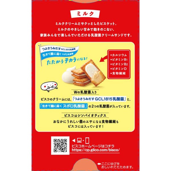 つよさうみだすGCL1815乳酸菌と生きて腸に届くスポロ乳酸菌入り・ミルククリームとサクッとしたビスケット。 ミルクのやさしい甘みで飽きのこない、 家族みんなで楽しんでいただける乳酸菌クリームサンド・カルシウム、ビタミンD、ビタミンB1、ビタミンB2 がたっぷり