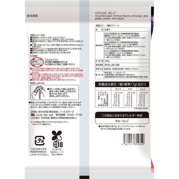 ぶどう味、りんご味、もも味の3種のフレーバーが楽しめる蒟蒻ゼリーのアソートです。国産こんにゃく粉使用のこんにゃくゼリーです。