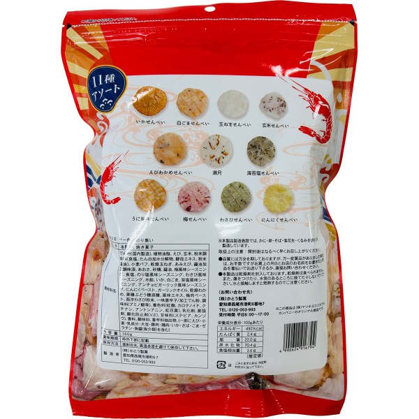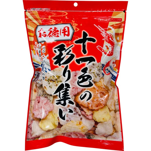 えび、いか、わかめ等11種類のおせんべいを詰め合わせた徳用お好みせんべい袋です。保存に便利なチャック付き袋です。