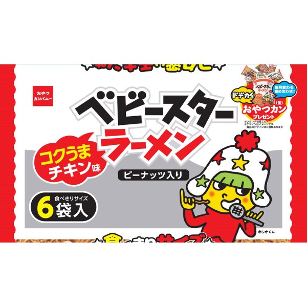 ベビースターとピーナッツをミックスした辛くないおつまみ!チキンの旨みと香味野菜を練りこむことで、通常のチキン味よりもコクがアップしています。食べきりサイズの小袋包装です。