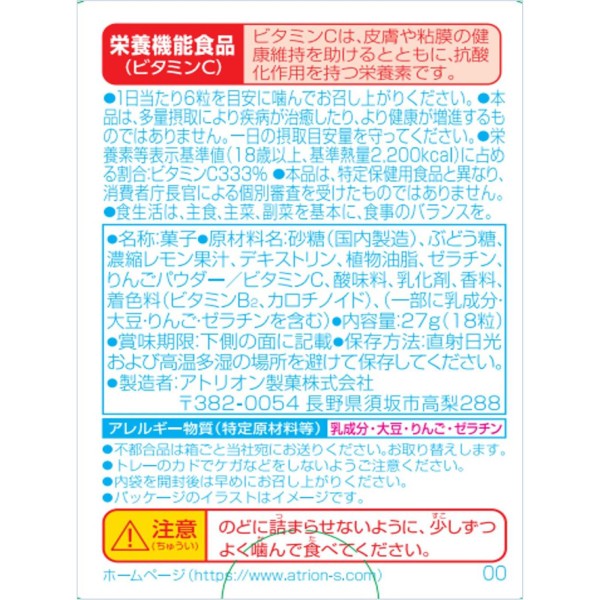 ビタミンCが配合されたおいしく健康的なタブレット菓子。甘酸っぱくておいしいレモン味。栄養機能食品。