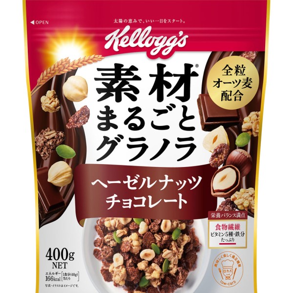 香り高いヘーゼルナッツと濃厚な味わいのチョコレートのハーモニーを楽しめる大人のチョコレートグラノラです。大粒の香ばしいヘーゼルナッツ、チョコレートでコーティングをしたケロッグ自慢のコーンフレーク、味わい深いオーツ麦など、それぞれの素材まるごとのおいしさをお楽しみいただける商品に仕上げました。ヘーゼルナッツチョコらしい重厚で深みのある味わいに、軽快な味と食感のフレークと合わさり、毎日おいしく食べていただけます。フレークのパイオニアであるケロッグが作る新境地グラノラです。