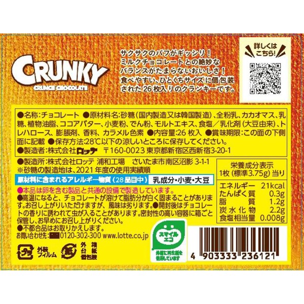 サクサク食感が楽しめるロッテのクランキー!サクサク食感にこだわったオリジナルのモルトパフを、まろやかな味わいのミルクチョコレートにギッシリ詰め込みました。