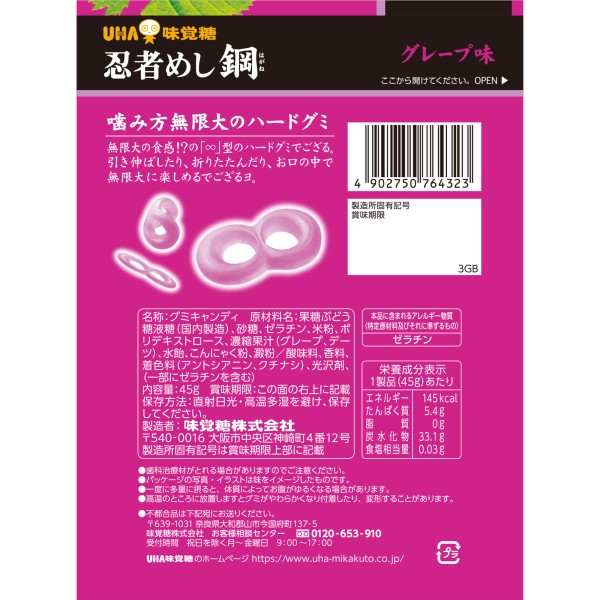 噛み方無限大。∞の形をしたグレープ味のハードグミ。そのまま噛んでハードな噛み心地を楽しむも良し、折りたたむようにして厚さを変えたり、2つの穴で遊んだり、1つのグミで楽しみ方は無限大!