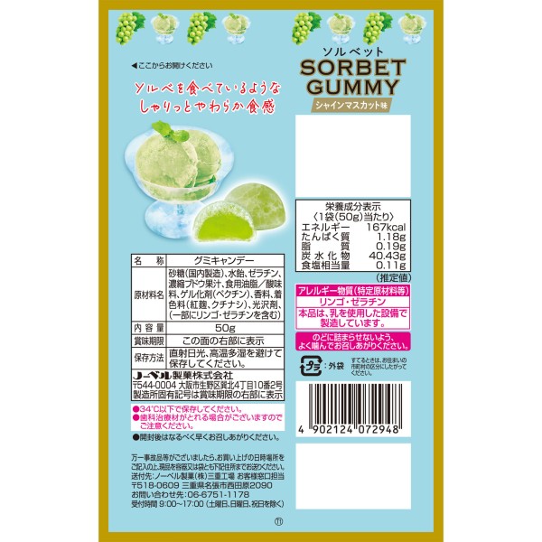 まるでソルベを食べたかのようなしゃりっとやわらか食感のグミです。芳醇香りと上質な甘みを感じることができるシャインマスカット味が楽しめます。