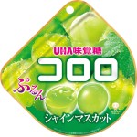 果実そのものを食べるようなジューシー感と果汁感の新食感グミ、コロロのマスカット味。シャインマスカット果汁を使用しています。