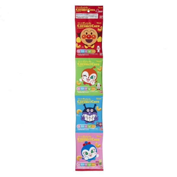 お子様にもうれしい、カルシウム入りで甘味料不使用の、ノンフライでこつぶサイズのアンパンマンキャラメルコーンです。小分けに便利な小袋の4連包です。
