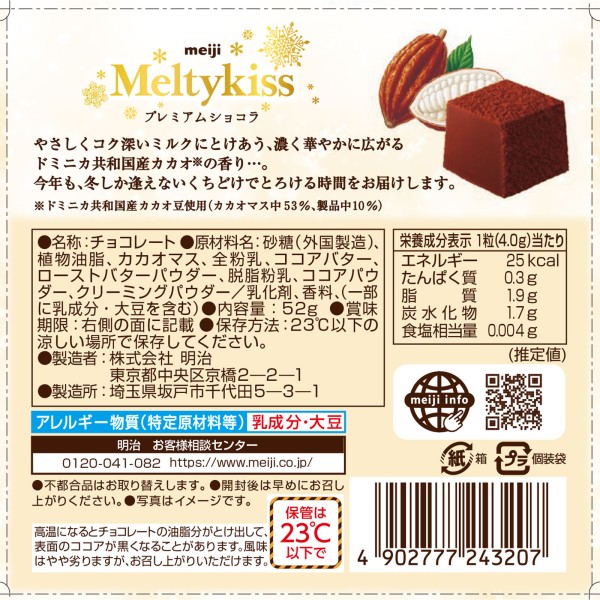 口に入れた瞬間からとろけだす雪のようなくちどけと、くちどけとともに広がる香りとやさしい甘さ、専門店のチョコレートのようなココアパウダーをまとったキューブ形状。冬期限定の特別感と唯一無二の雪のようなくちどけ。