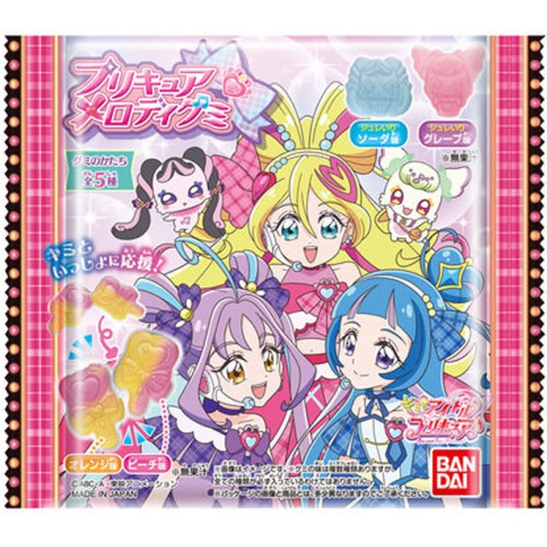 「キミとアイドルプリキュア」のモールドグミ!パッケージは全2種、グミのかたちは全5種です!味はジュレいりグレープ味・ジュレいりソーダ味・ピーチ味&オレンジ味です。グミキャンディ33g(C)ABC-A・東映アニメーション