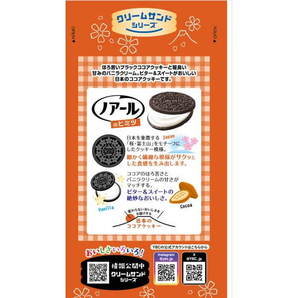 ココアの風味とバニラクリームの甘みが絶妙にマッチしたビター&スイートのおいしさ。サクッと軽い食感のココアクッキーとバニラクリームのベストバランスです。