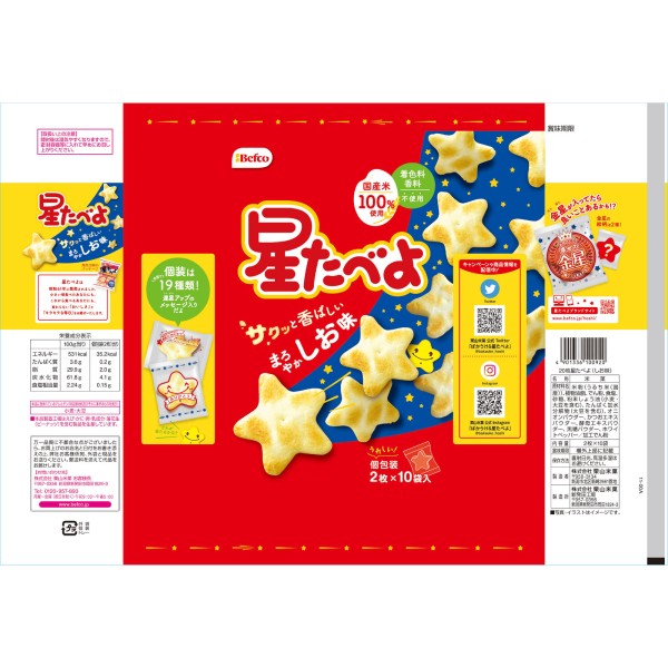 ・かわいい星の形のおせんべいです。・香料・着色料不使用のサクッと香ばしい「しお味」・個包装デザインは全部で19種類(※ランダム封入)